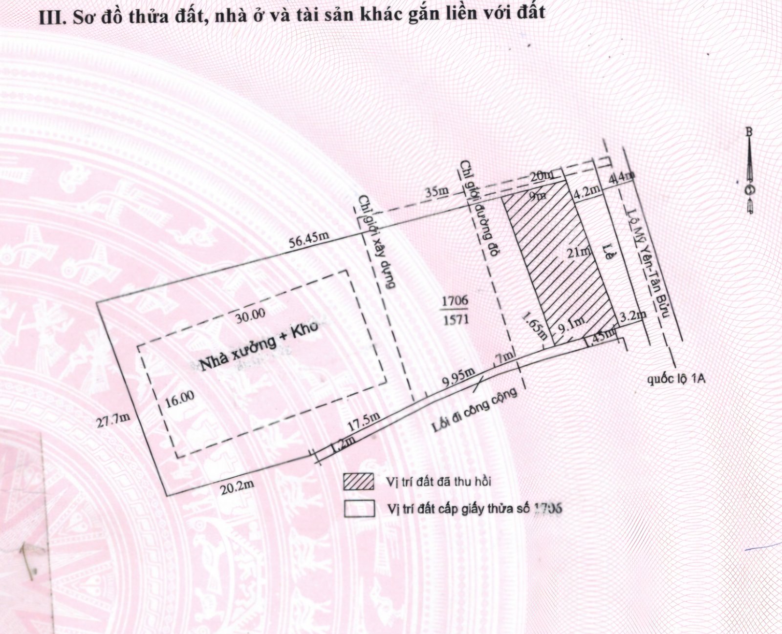 Diện tích 1.571m², mặt tiền đường Mỹ Yên – Tân Bửu, cách QL1A 500m, cách TP.HCM ~2,5km. Đất SXKD thời hạn đến 2055, đã hoàn công 480m² nhà xưởng, diện tích sử dụng thực tế khoảng 1.000m².